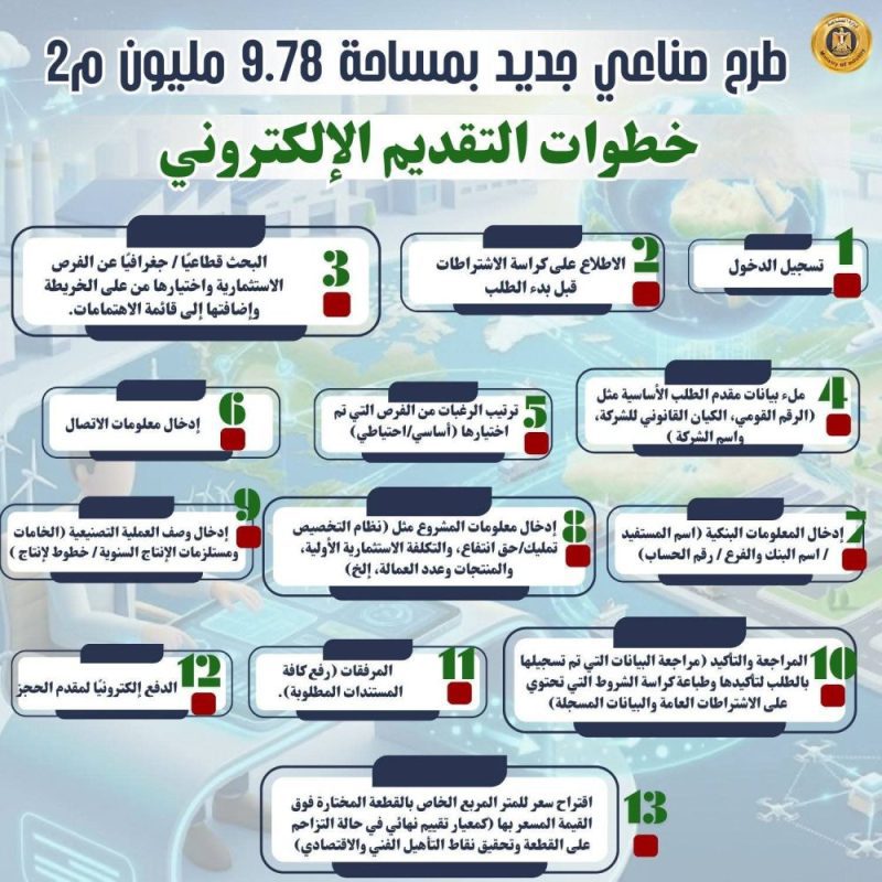 – كافة الطلبات ستخضع لدراسة دقيقة من قبل الهيئة العامة للتنمية الصناعية، وسيتم إعلان النتائج من خلال المنصة، بعد أسبوعين فقط من غلق باب التقديم، وإخطار المستثمرين بنتيجة التخصيص عبر الرسائل النصية والبريد الإلكتروني.