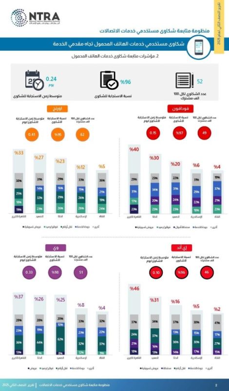 بلغ معدل شكاوى خدمات الهاتف المحمول 52 شكوى لكل ١٠٠ ألف مشترك، وبلغت نسبة الاستجابة للشكاوى بعد التصعيد للجهاز 96%، كما بلغ متوسط وقت الاستجابة للشكوى 0.24 يوم.