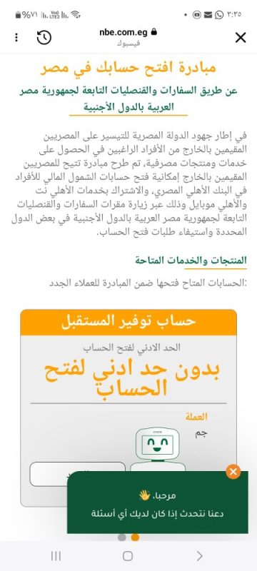 اطلق البنك الاهلي المصري مبادرة تتيح للمصريين المقيمين بالخارج إمكانية فتح حسابات الشمول المالي للأفراد في البنك الأهلي المصري، والاشتراك بخدمات الأهلي نت والأهلي موبايل وذلك عبر زيارة مقرات السفارات والقنصليات التابعة لجمهورية مصر العربية بالدول الأجنبية في بعض الدول المحددة واستيفاء طلبات فتح الحساب.