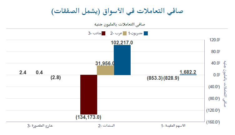 سجلت تعاملات المصريين نسبة 87.8 % من إجمالى التعاملات على الأسهم المقيدة ، بينما استحوذ الأجانب على نسبة 7.5 % و العرب على 4.6 % و ذلك بعد استبعاد الصفقات. و قد سجل الأجانب صافي بيع بقيمة 853.3 مليون جنيه بينما سجل العرب صافي بيع بقيمة 868.1 مليون جنيه و ذلك بعد استبعاد الصفقات.